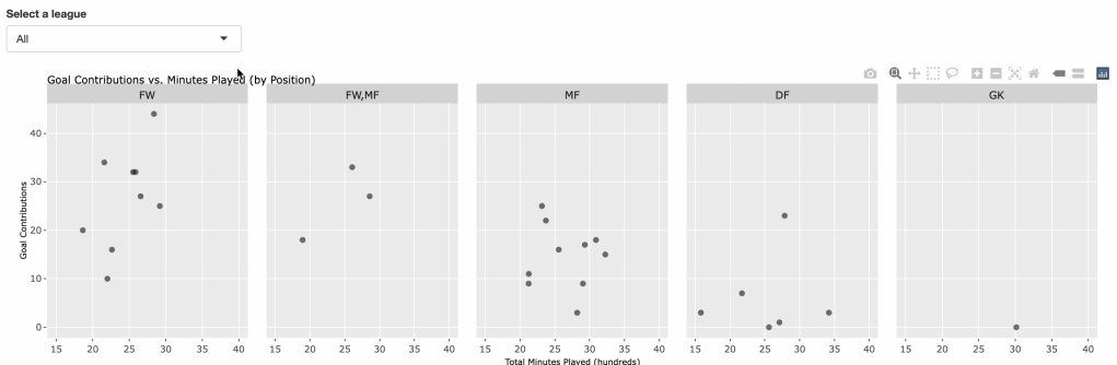 Figure 3: Goal Contributions by position. Users and select points to learn more about each player. They can also highlight points to filter the rest of the data.
