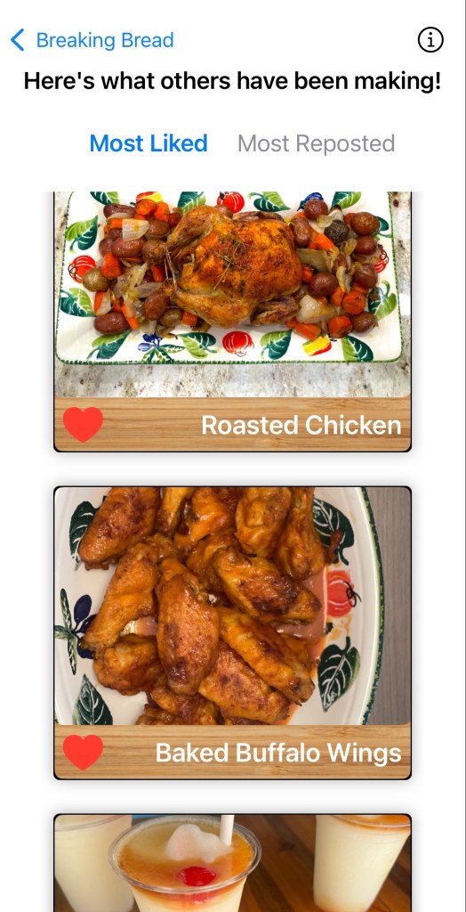 Top Recipes – See the most popular recipes, choose between most liked and most reposted. Liked recipes are saved to you profile, and reposts and shared to your friends.