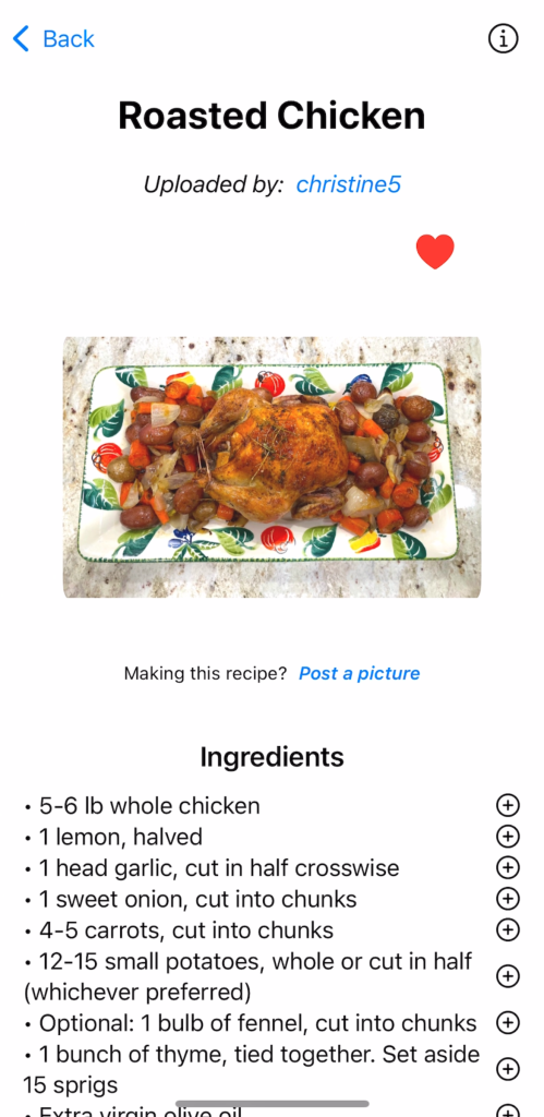 The Recipe – All the details you. need to make the recipe. Ingredients, instructions, original author, and liking/reposting capabilities. Add ingredients to grocery list by clicking the plus